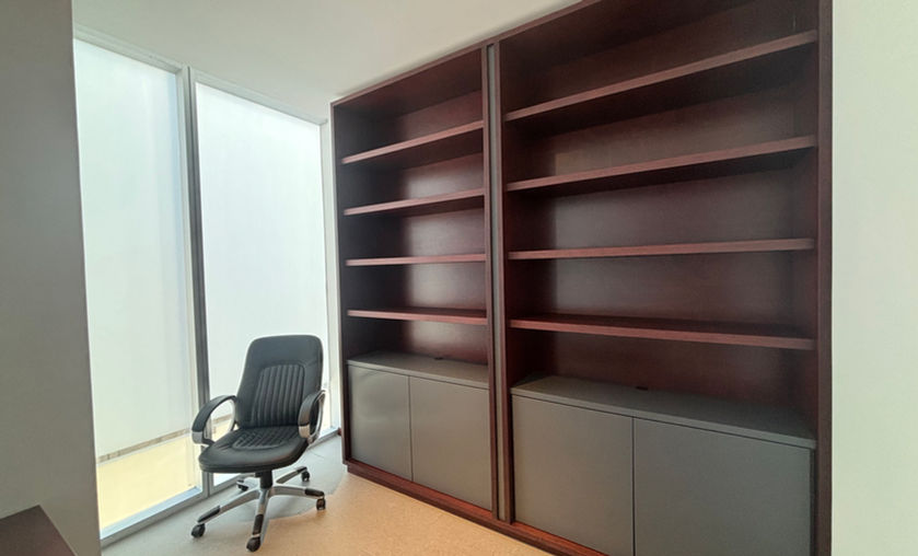 Oficina principal con escritorio y estantería.